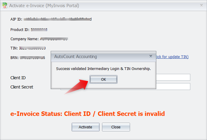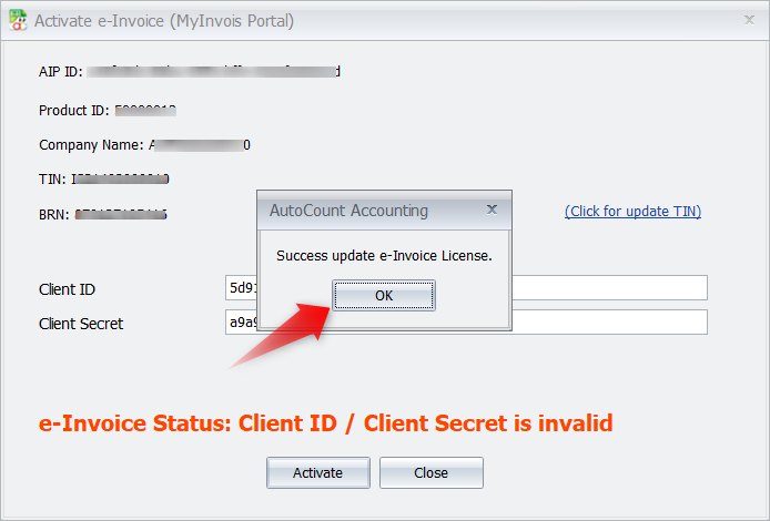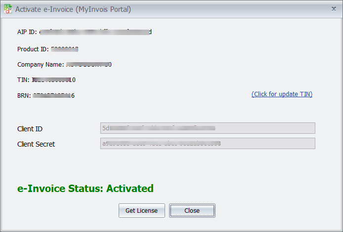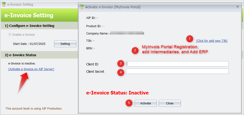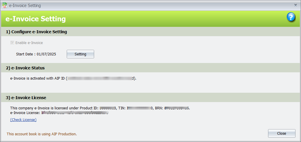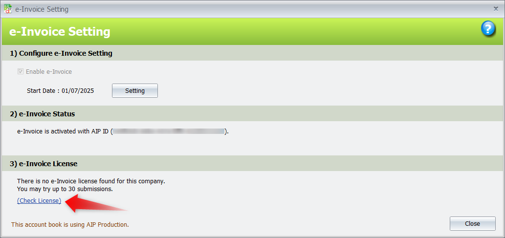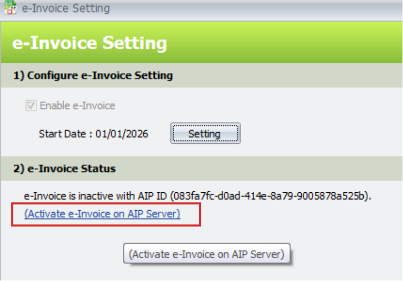 Click “Active e-Invoice on AIP Server” connect the server to your account and configures license settings