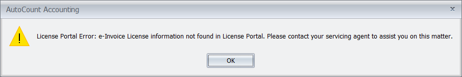 This error means e-Invoice license has not been registered on License Portal, contact your software provider for assistance.