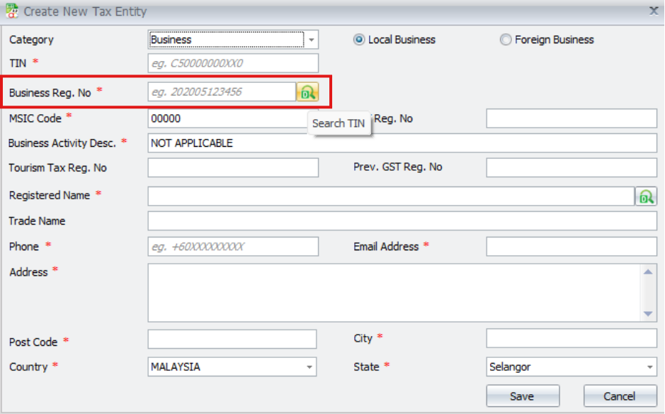 | *TIN | *Registration/IC/Passport | *SST Registration Number |
