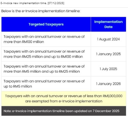 | 5. | Taxpayers with an annual turnover or revenue of up to RM1 million | 1/7/2026 to 31/12/2026 |