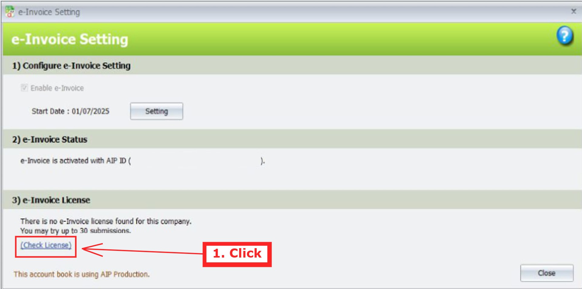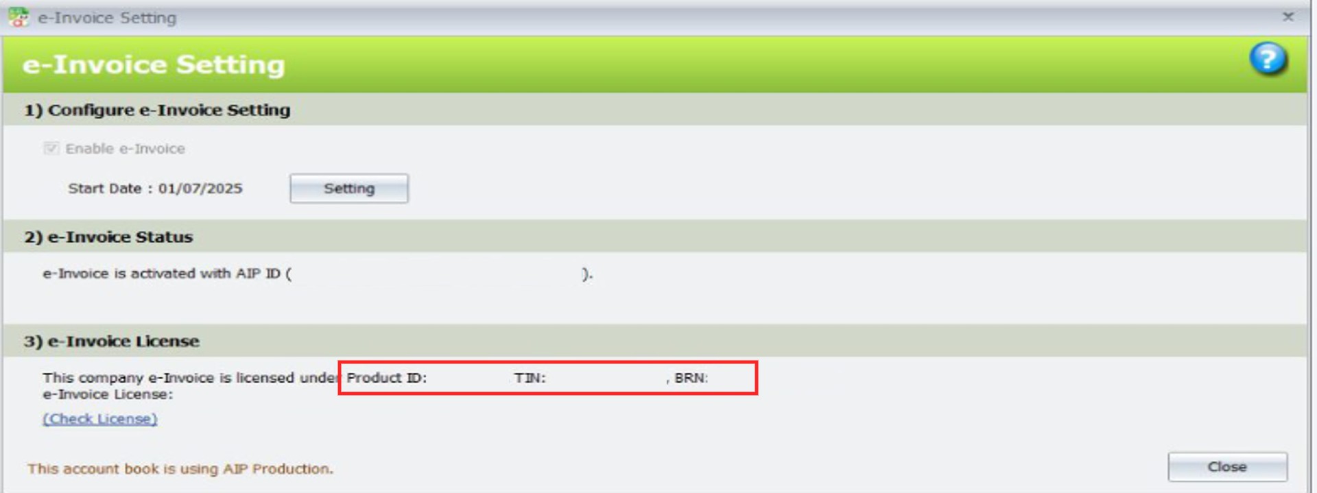 Once the e-Invoice license is successfully activated, the system will dispplay that this company’s e-Invoice is licensed under the Product ID, TIN, BRN, & e-Invoice License