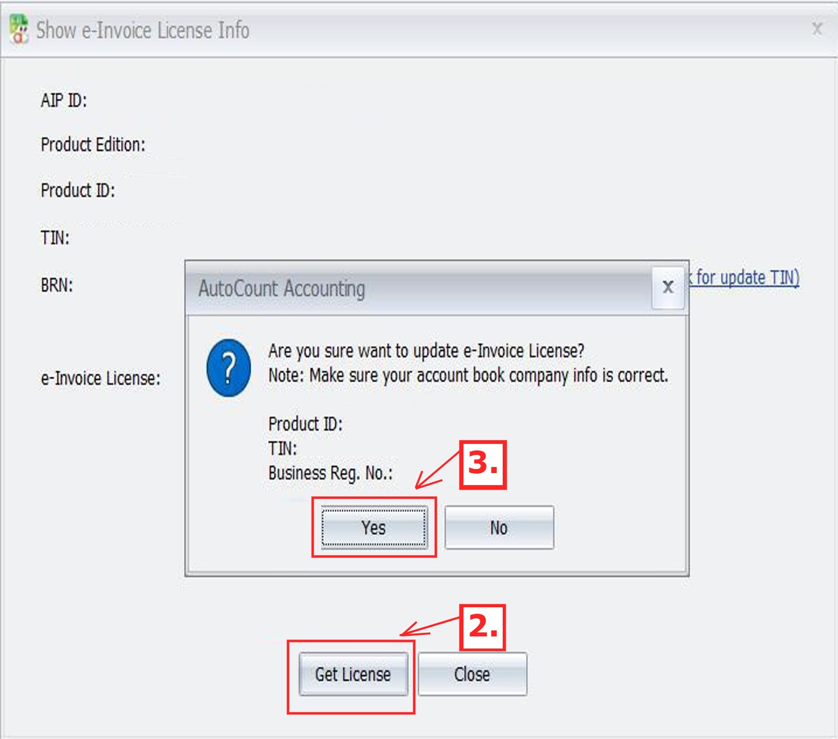 Click “Get License” (2) > Verify all information is correct, then click “Yes” to confirm (3)