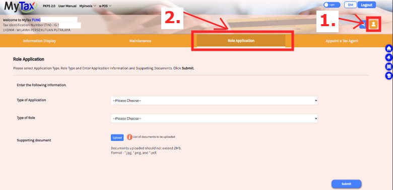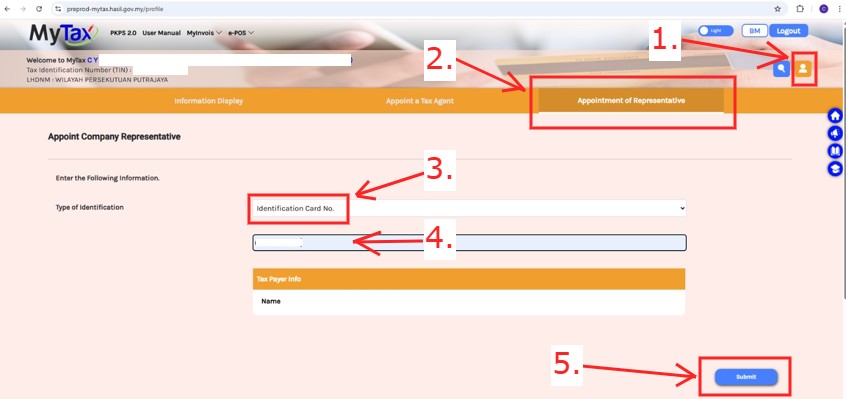 Click on the right-side User icon (1) > Click Appointment of Representative (2) > Select ID Type (IC) (3)