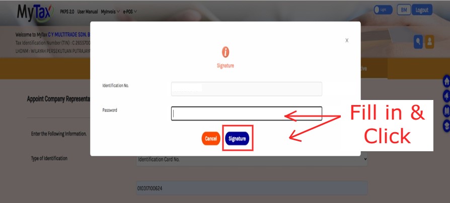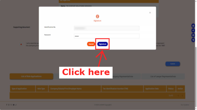 5) It will prompt for your passowrd for confirmation. Key in your password and click “Signature” to proceed