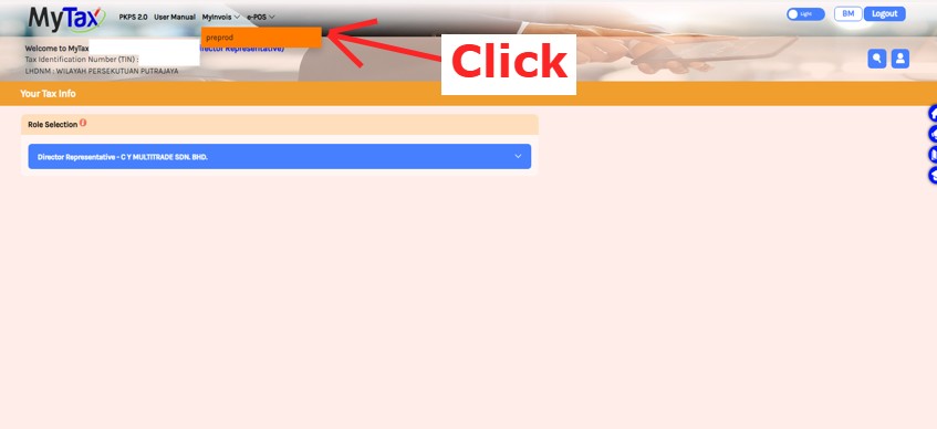 1) Access to MyInvois > Preprod. Please make sure you are in your company profile to do this