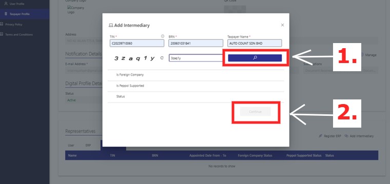 4) Key in your intermediary TIN, BRN & Name. You may key in AutoCount’s info here: