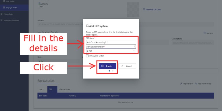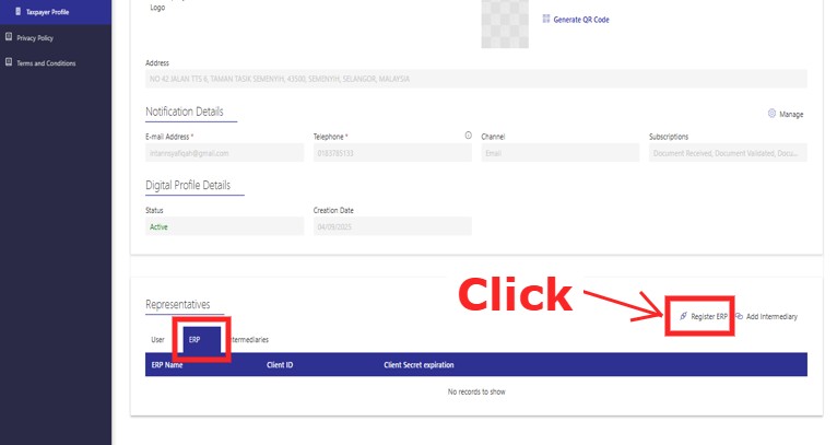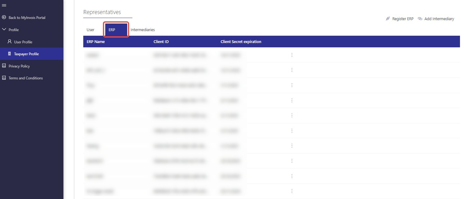 3) At the Taxpayer profile, scroll to the bottom. There is a table for you to add ERP. Click “Register ERP”
