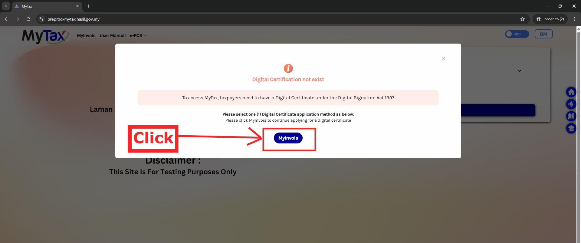 3) It will prompt you that your “Digital Certification not exist”. Click “MyInvois” button to proceed