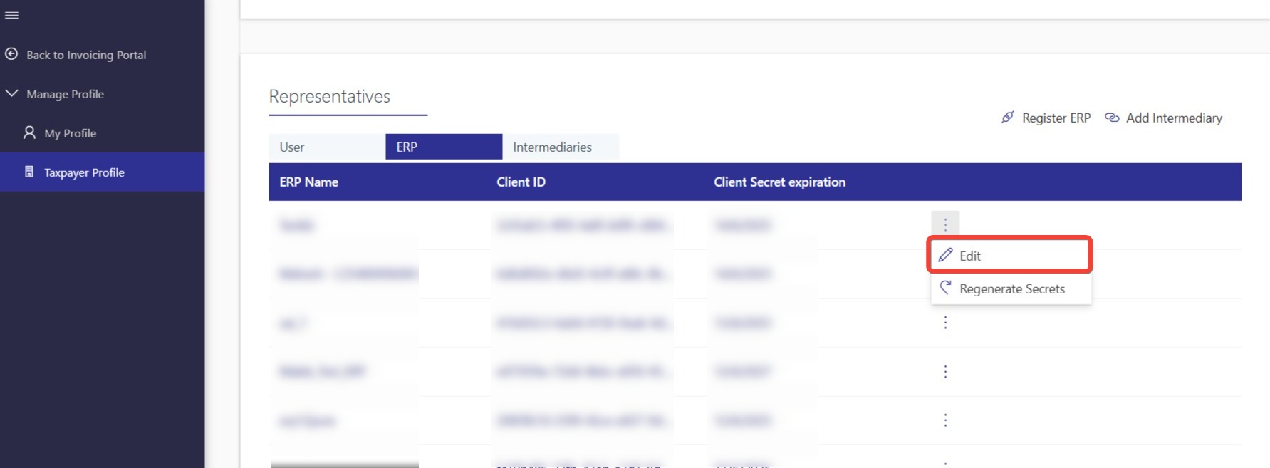 On the ERP row you want to edit, click on more options (⋮), then select “EDIT”