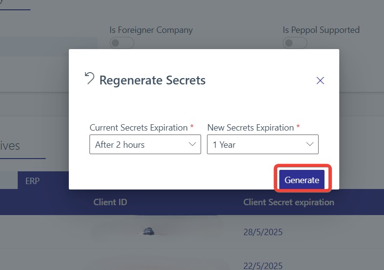 On the ERP row you edited, click on more options (⋮) again, click REGENERAT SECRETS