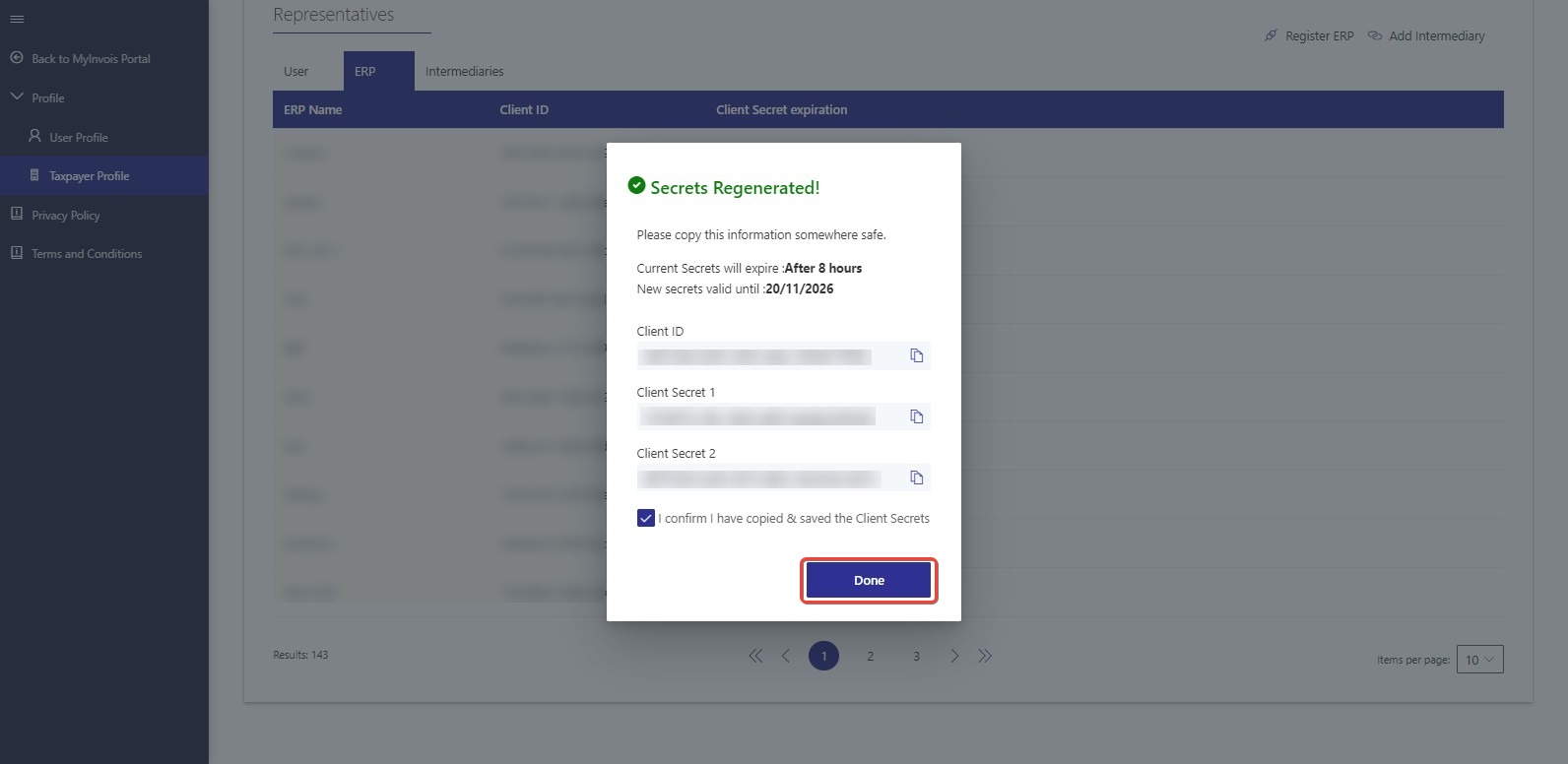 Copy the new Client ID & Client Secrets displayed & check the box to confirm that you have copied, then click on Done button