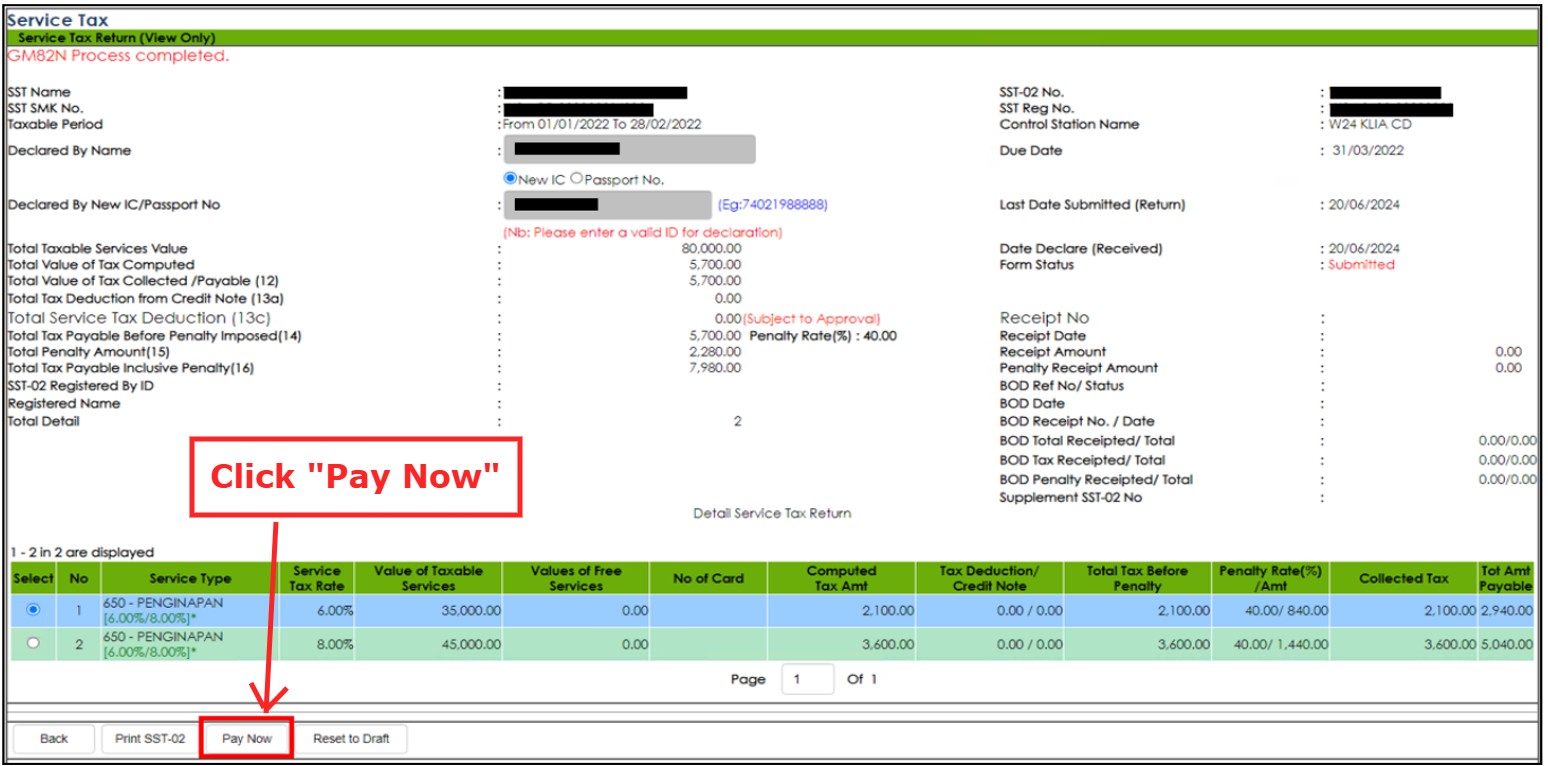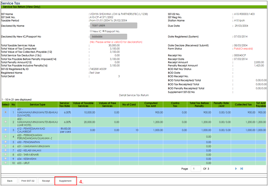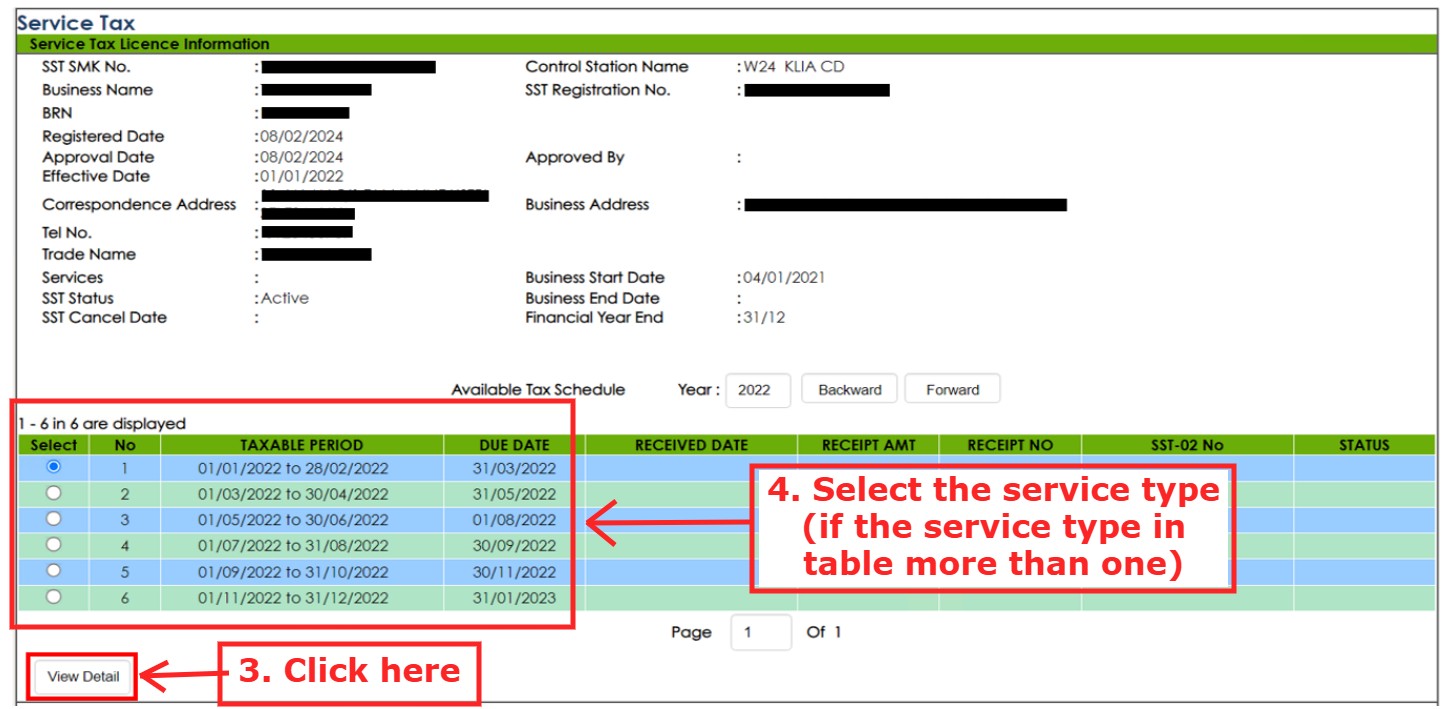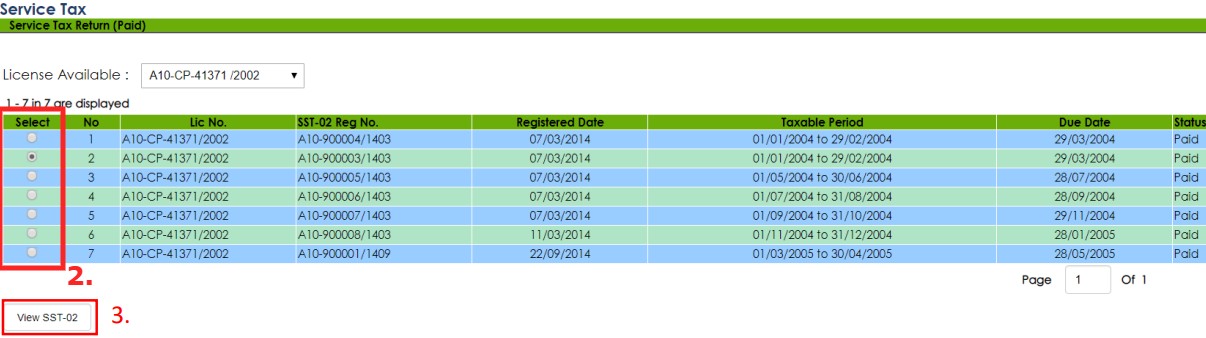 Choose & Click on Service Tax to select (2) > Click “View SST-02” to view selected Service Tax (3)