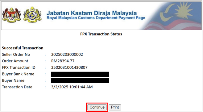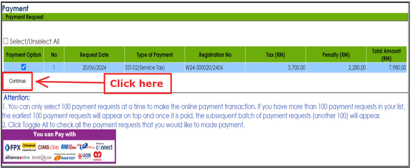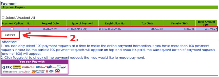 Tick on checkbox of selected payment option. Then, click “Continue” (2)
