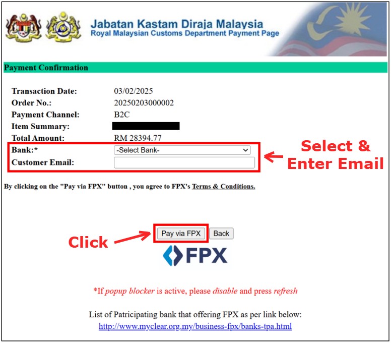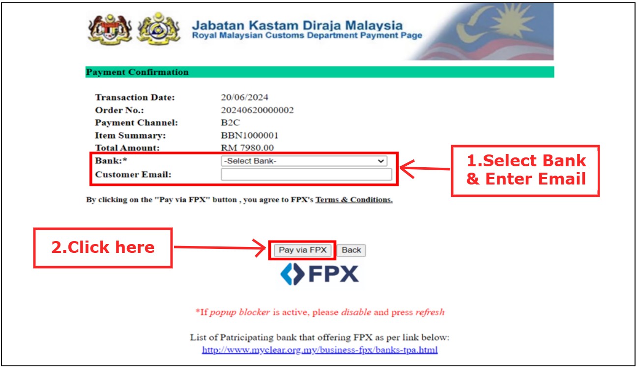Select Bank & Enter Customer Email (1) > Click “Pay via FPX” (2)