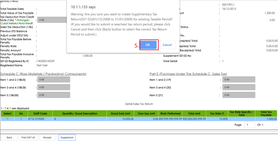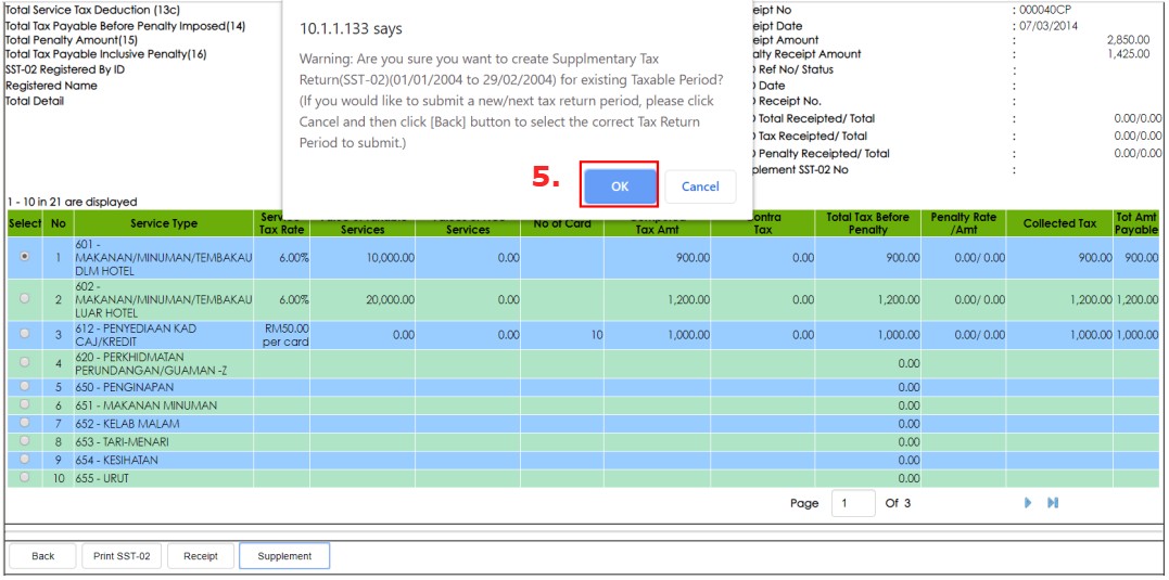 | Note: Supplementary Tax, “Supplement” button only appear on Paid Tax Return. Supplementary Tax Submission is additional submission for same taxable period that you have miss out. You can only submit up to 9 times supplementary tax submission of same taxable period. If you accidentally create the supplement, please request Customs to cancel this supplement. |
