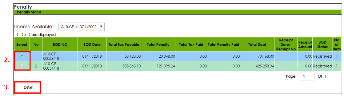 Choose & click penalty to view (2) > Click “Detail” to view detail about penalty (3)
