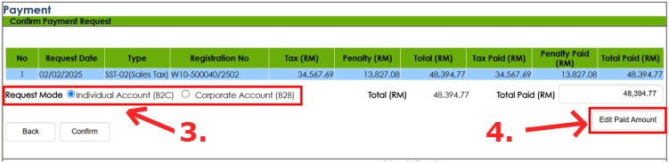 Select Request Mode either B2C/B2B (3) > Edit total paid amount in the Total Paid (RM) field (4)
