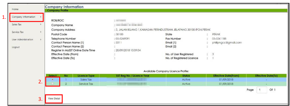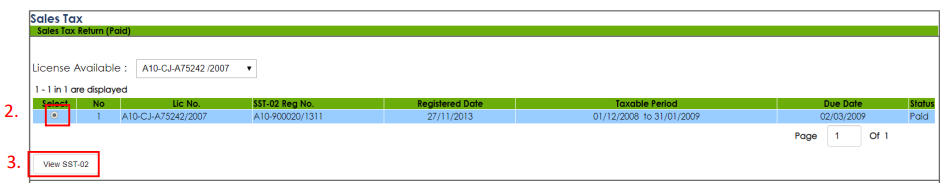 Select the Sales Tax License (2) > Click “View SST-02” to view license detail