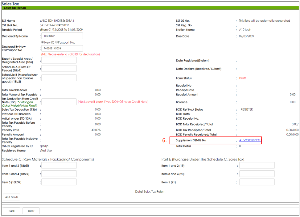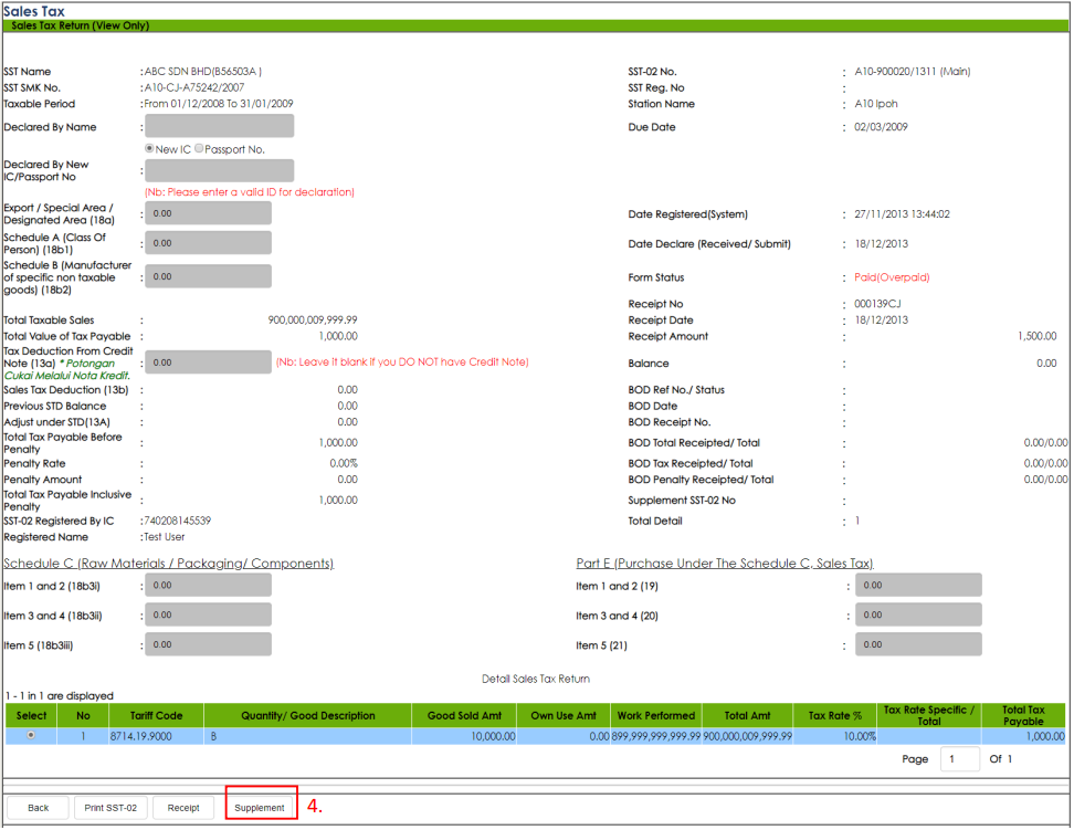 Sales Tax Return page will appear & supplement number will be shown once supplement has been made (6)