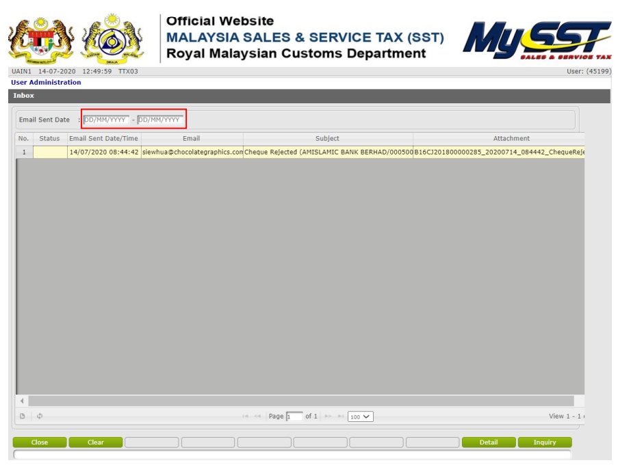 Choose Email sent Date > Click Inquiry to search data based on selected date