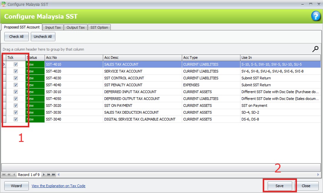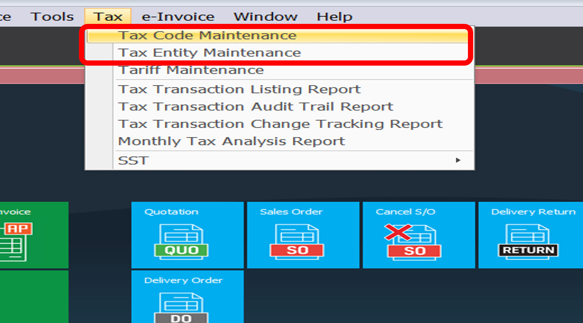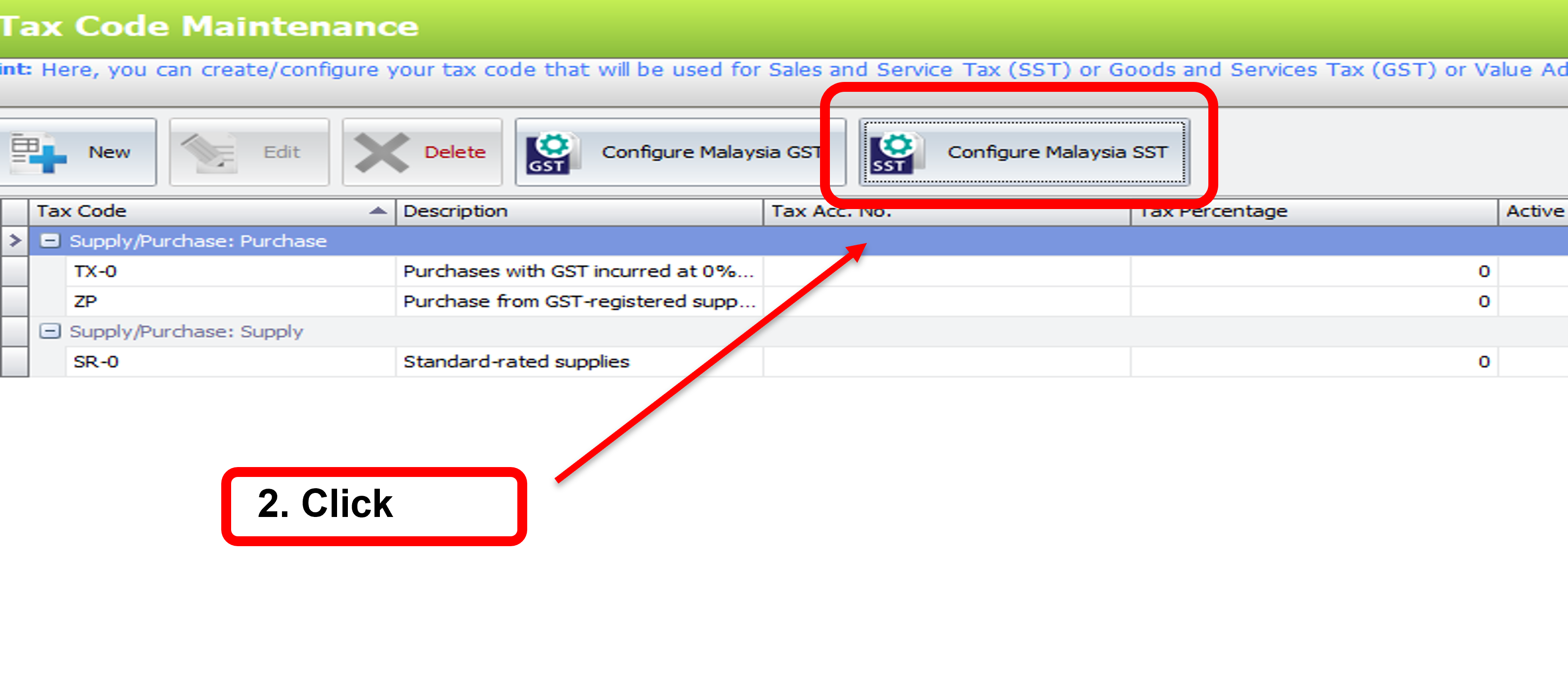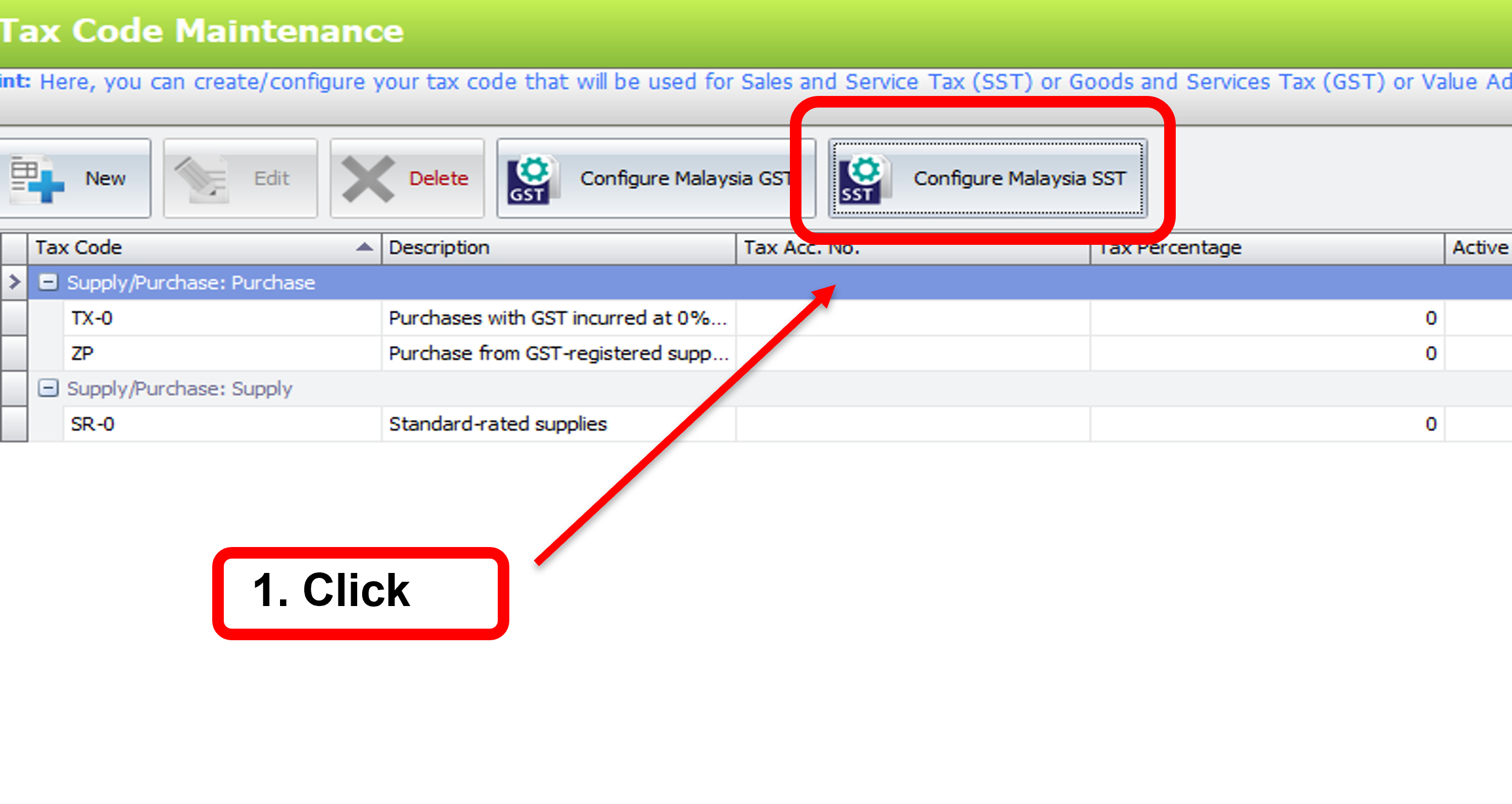 Go to Tax > Tax Code Maintenance > Click Configure Malaysia SST