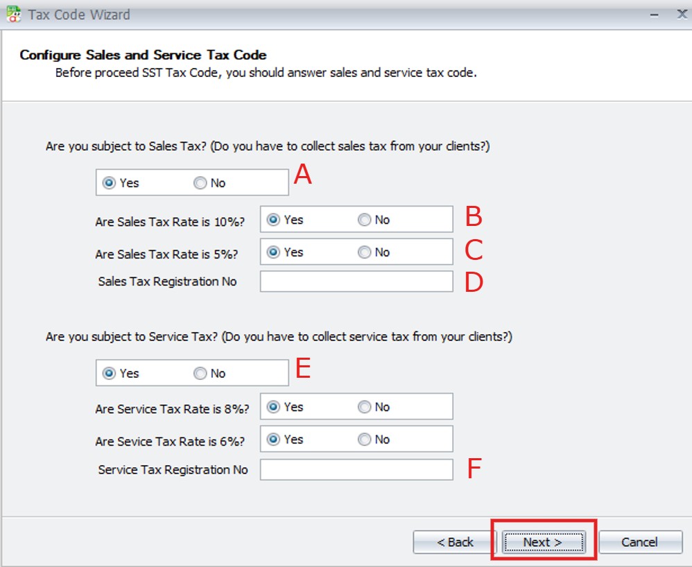 | D | Key in company Sales Tax Registration No. This will be updated into company profile |