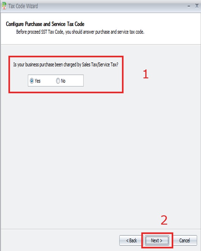“YES” (1) if your company purchases are from SST registered company > click “NEXT” (2)