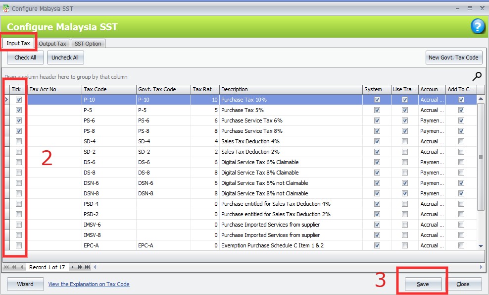 B) Select Input Tax > Tick to select/Untick to ignore (2) > Click SAVE (3)