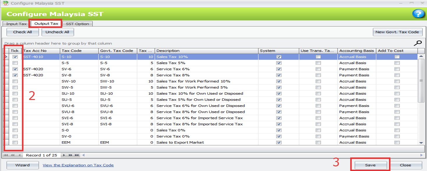 C) Select Output Tax > Tick/Untick (2) > SAVE (3)
