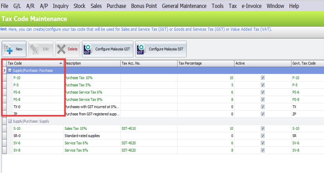 - Suppliers/Vendors that charge them SST can use our purchase tax codes when key in their purchases