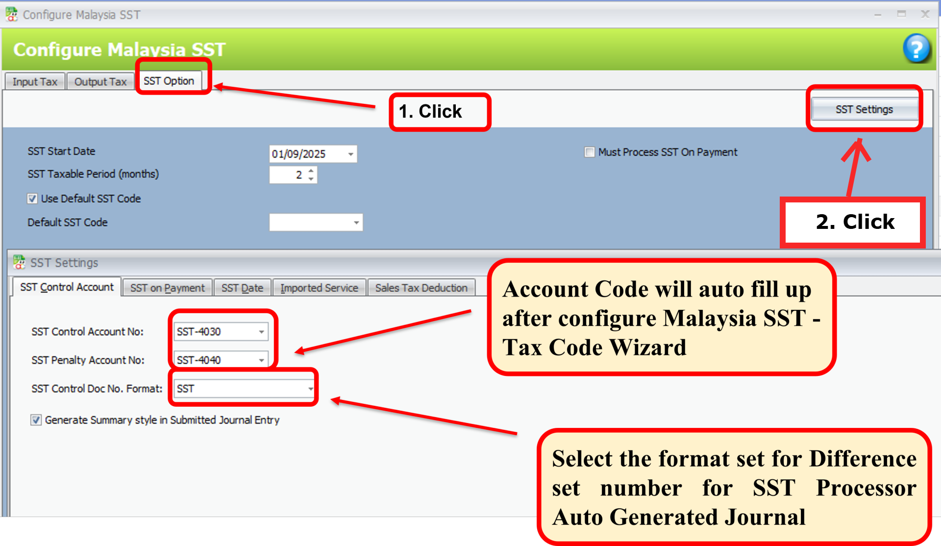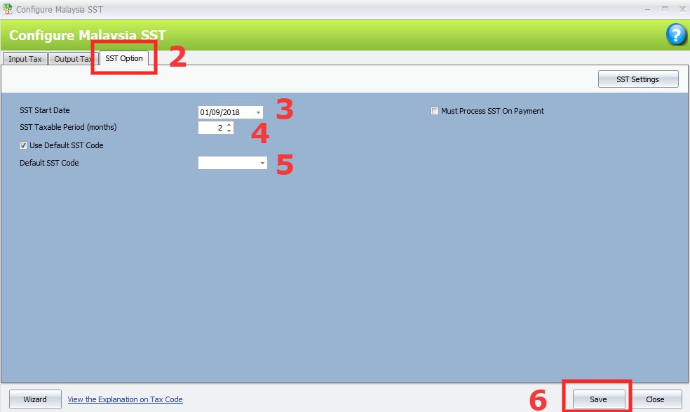 | 5 | Default SST Code is where you can set generally which tax code to be capture |