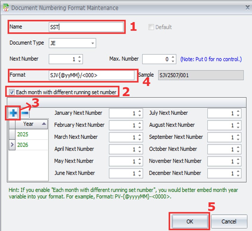 1. Specify Format Name > 2. Tick on the check box > 3. Click “+” > 4. Set the Format > 5. Click “OK”