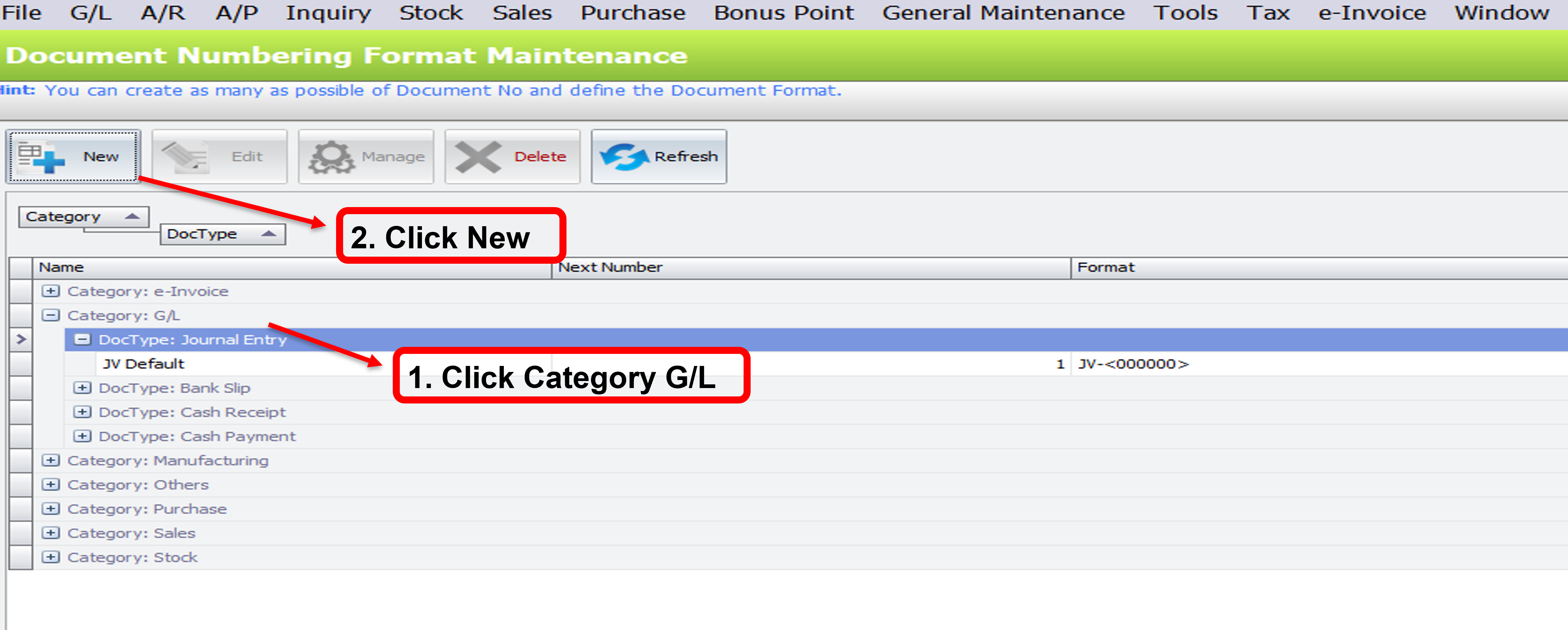 Expand “Category: GL” (1) > Click “NEW” (2)
