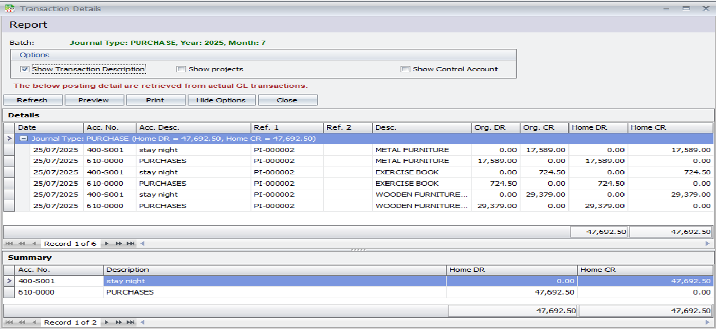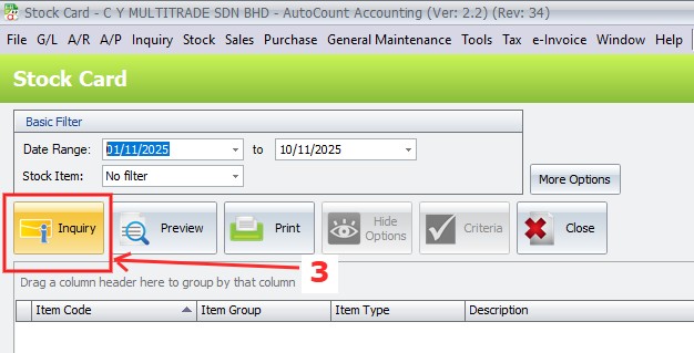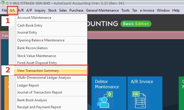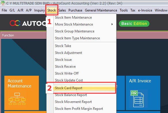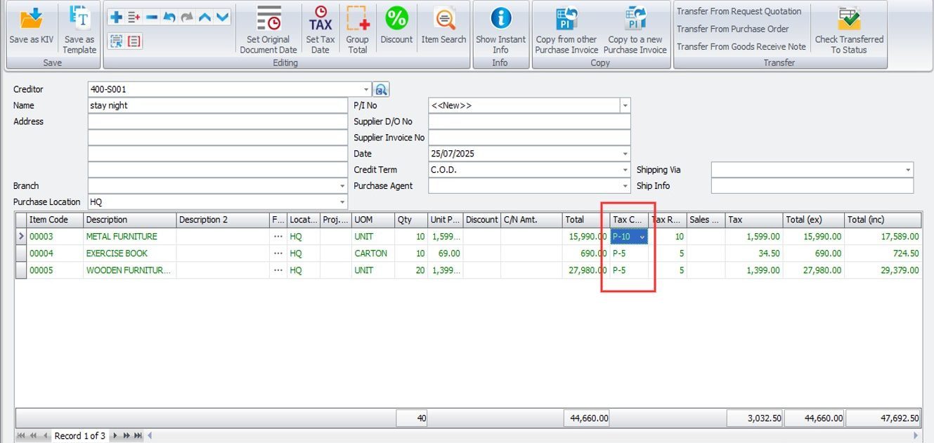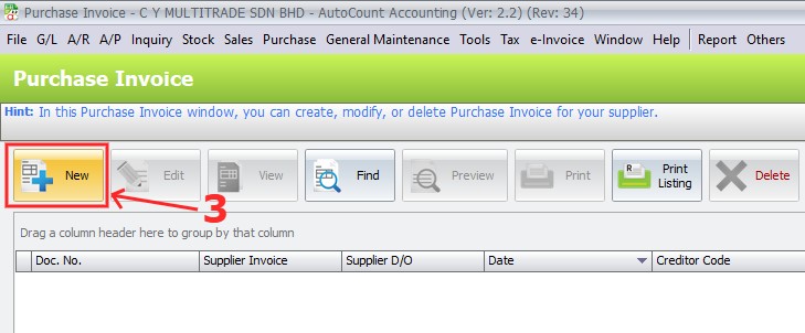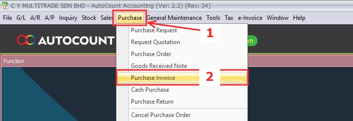 Click Purchase (1) > Purchase Invoice (2) in the navigation bar