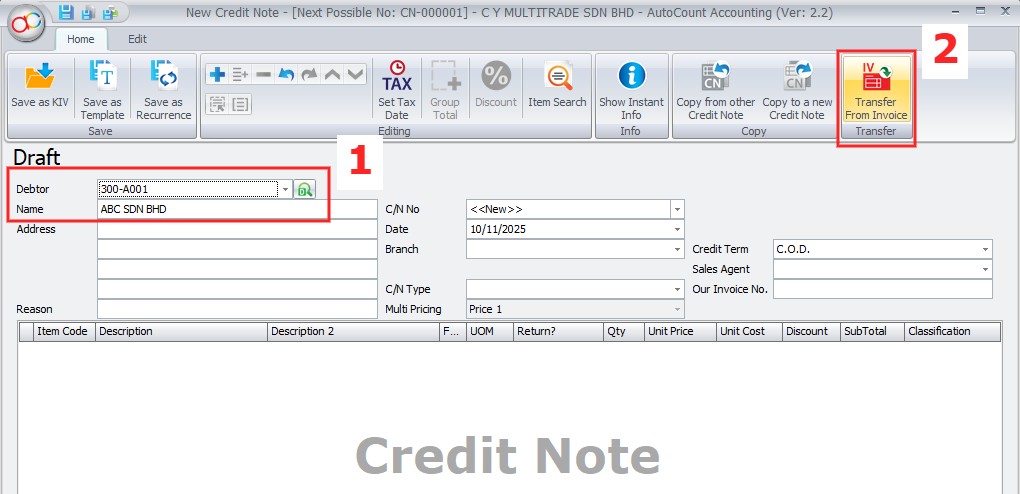 Select a Debtor (1) > Click Transfer From Invoice (2)