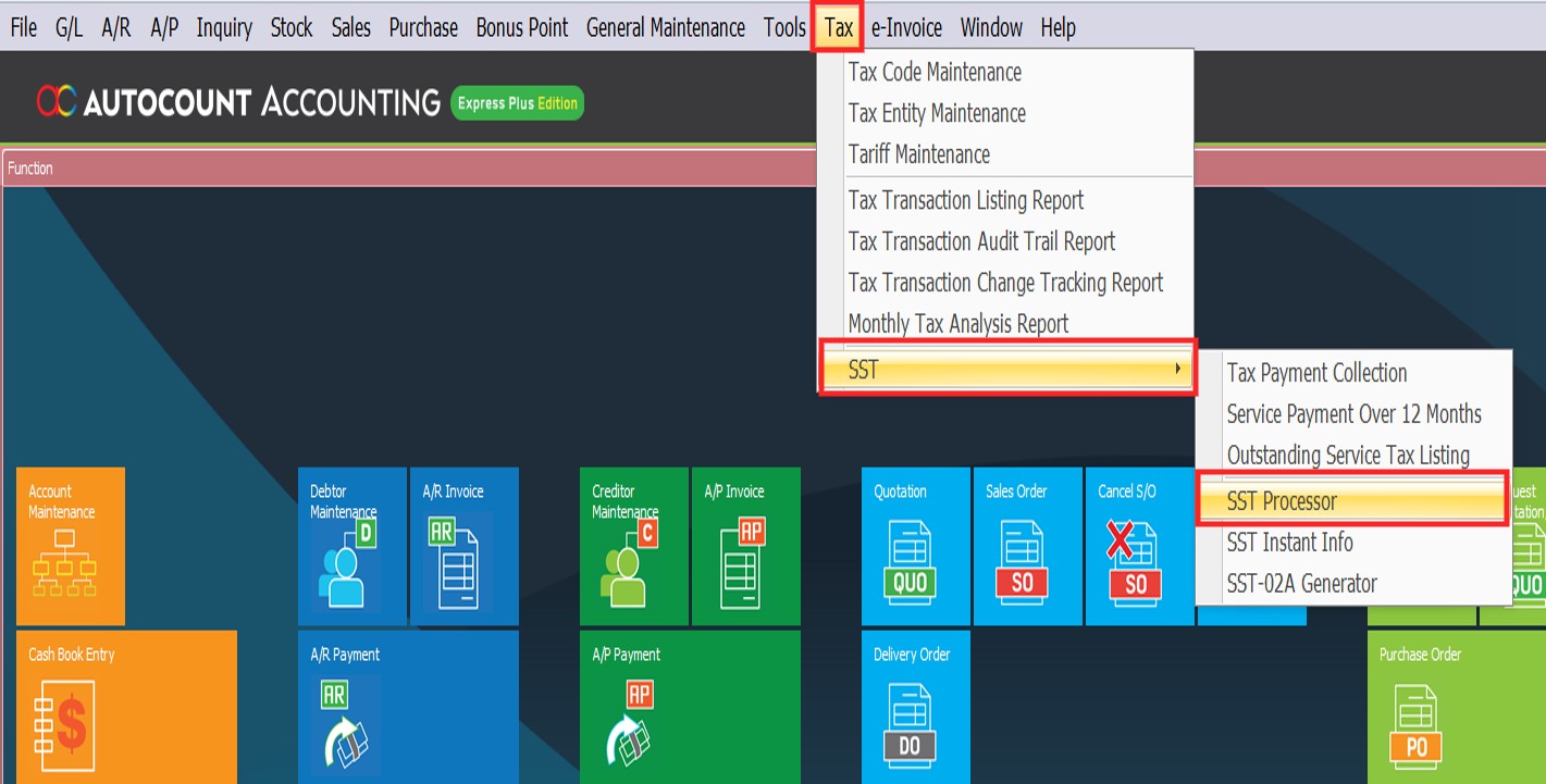 User can now access the SST Processor, allowing the system to calculate their SST based on their taxable period & generate a summary of tax codes & amount with SST-02 Form. User can access this under: