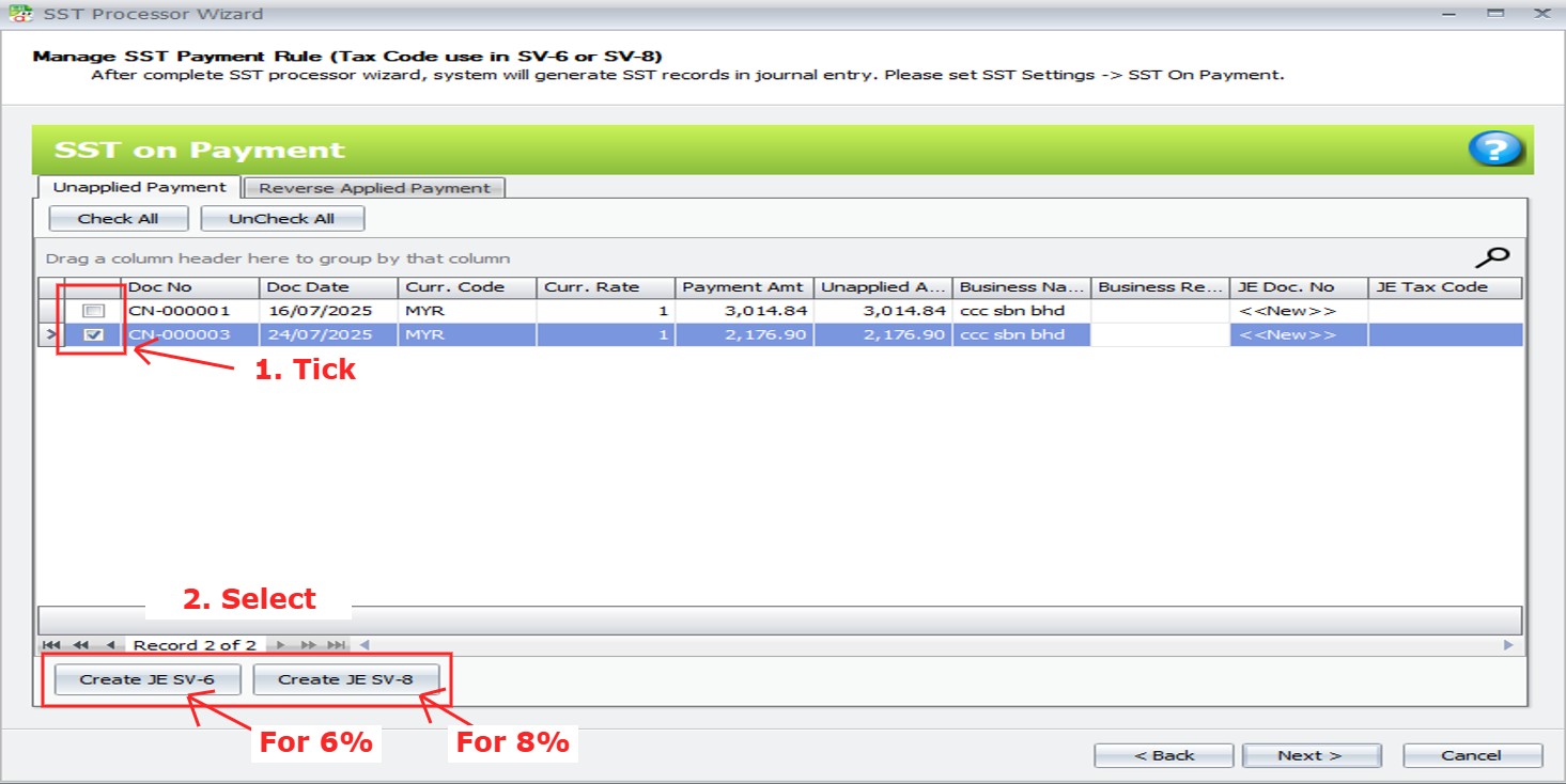 Select “Create JE SV-6” for 6% / “Create JE SV-8” for 8% (2)