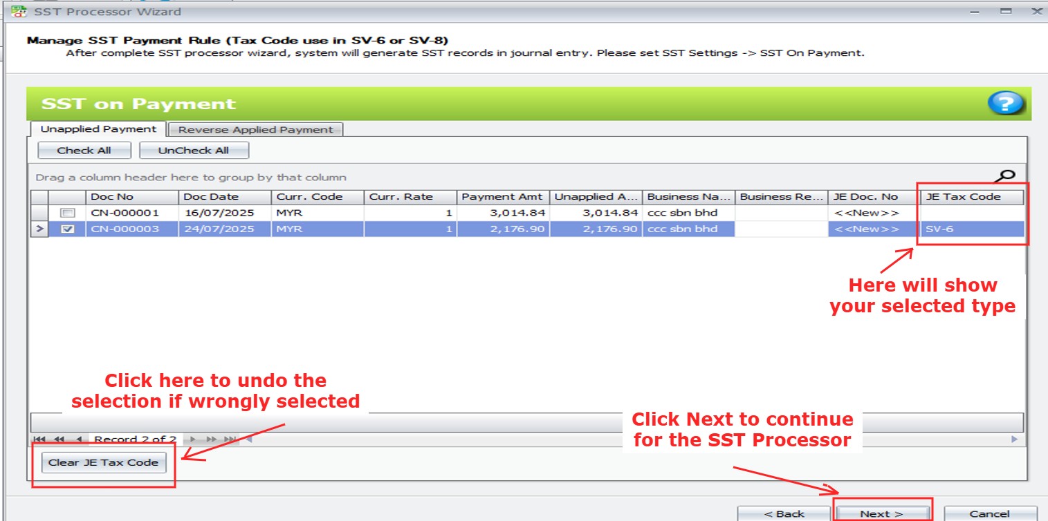 In case you have wrongly selected, you may click “Clear JE Tax Code” to undo
